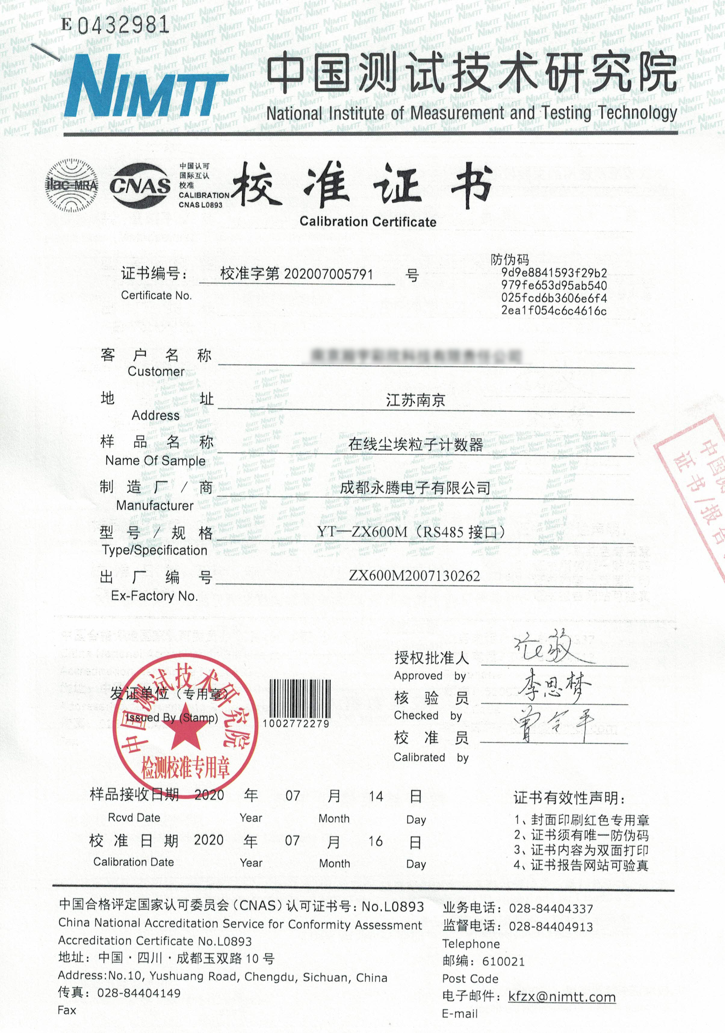 南京客戶采購的600M粒子計(jì)數(shù)器校準(zhǔn)報(bào)告
